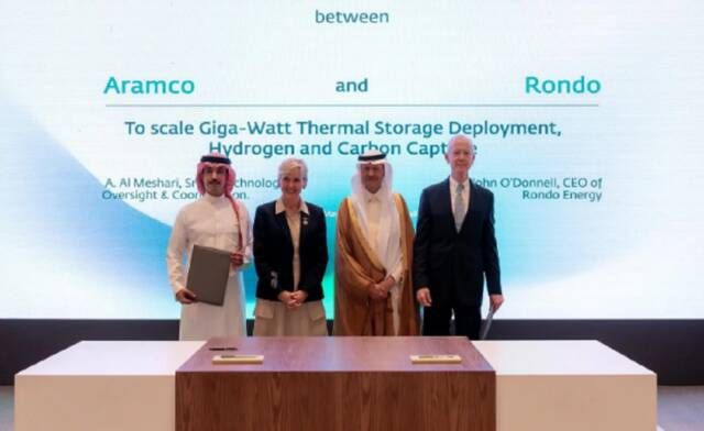 أما الاتفاقية الثالثة، فقد اتفقت أرامكو وروندو على إمكانية استخدام بطاريات حرارية في منشآت أرامكو العالمية لتقليل تكاليف التشغيل ودعم مبادرات تقليل الانبعاثات، وبدأت الشركتان دراسات هندسية لأول عملية استخدام على نطاق صناعي لبطاريات روندو الحرارية التي من الممكن أن تسهم في خفض الانبعاثات من منشآت أرامكو السعودية، مع زيادة النطاق لاحقًا ليصل إلى 1 جيجاوات في الساعة.