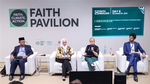 تواصلت فعاليات جناح الأديان في COP28 لليوم السادس على التوالي، بعقد عدة جلسات ركزت على القيادة الحكيمة للانتقال إلى التكنولوجيا النظيفة، والعمل الخيري الديني المحفز للعمل المناخي، وزيادة الثقة والشفافية من أجل انتقال عادل للطاقة النظيفة.