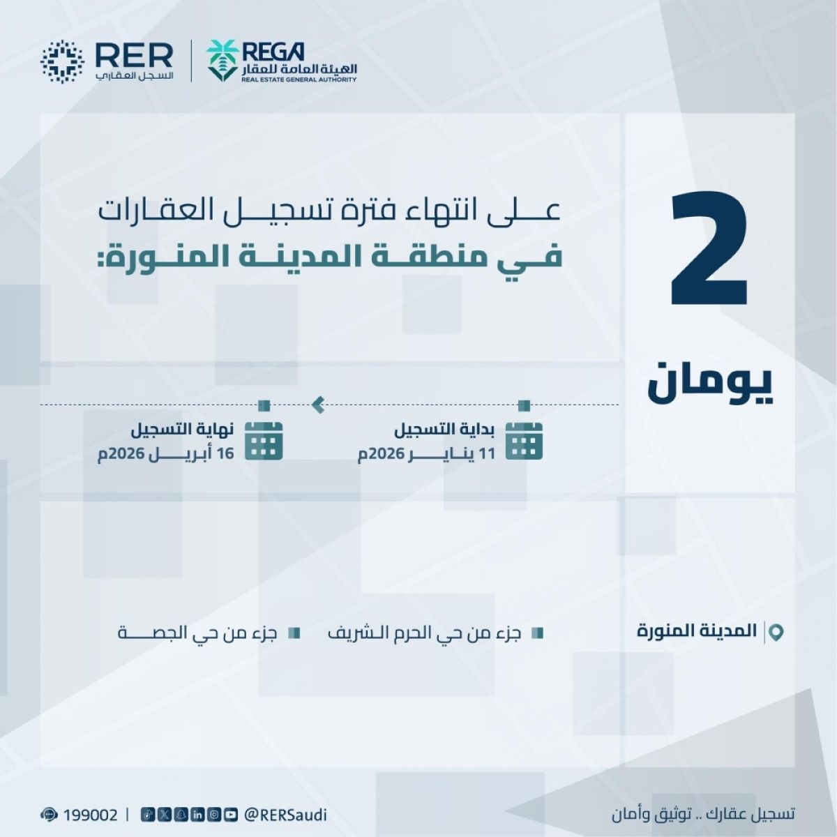 أعلنت الهيئة العامة للعقار عن قرب انتهاء المهلة المحددة للتسجيل العيني الأول للعقار لـ27 قطعة عقارية في 9 أحياء بمنطقتي مكة المكرمة والمدينة المنورة، وذلك بنهاية يوم الخميس 28 شوال 1447هـ، الموافق لـ 16 أبريل 2026م.